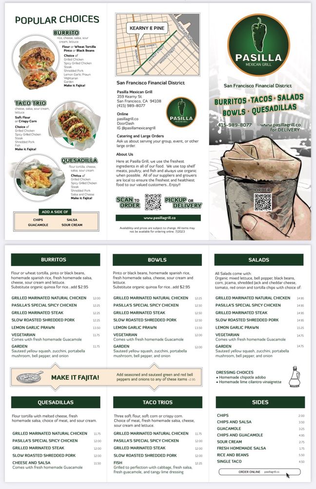 Pasilla Mexican Grill, located at 359 Kearny St in San Francisco, offers a delightful Mexican dining experience with options like burritos, bowls, and tacos. The menu features dishes like Grilled Marinated Chicken Burritos, Steak Bowls, and a variety of tasty Tacos. Customers rave about the flavorful marinated meats and the abundance of fresh homemade salsa options. The service is quick and the staff are friendly, creating a casual yet satisfying dining atmosphere. Whether you're looking for a quick lunch or a tasty meal to-go, Pasilla Mexican Grill is a solid downtown lunch option with a diverse menu that caters to both meat-eaters and vegetarians. Don't miss out on the chance to indulge in their tasty and filling Mexican fare next time you're in the area.